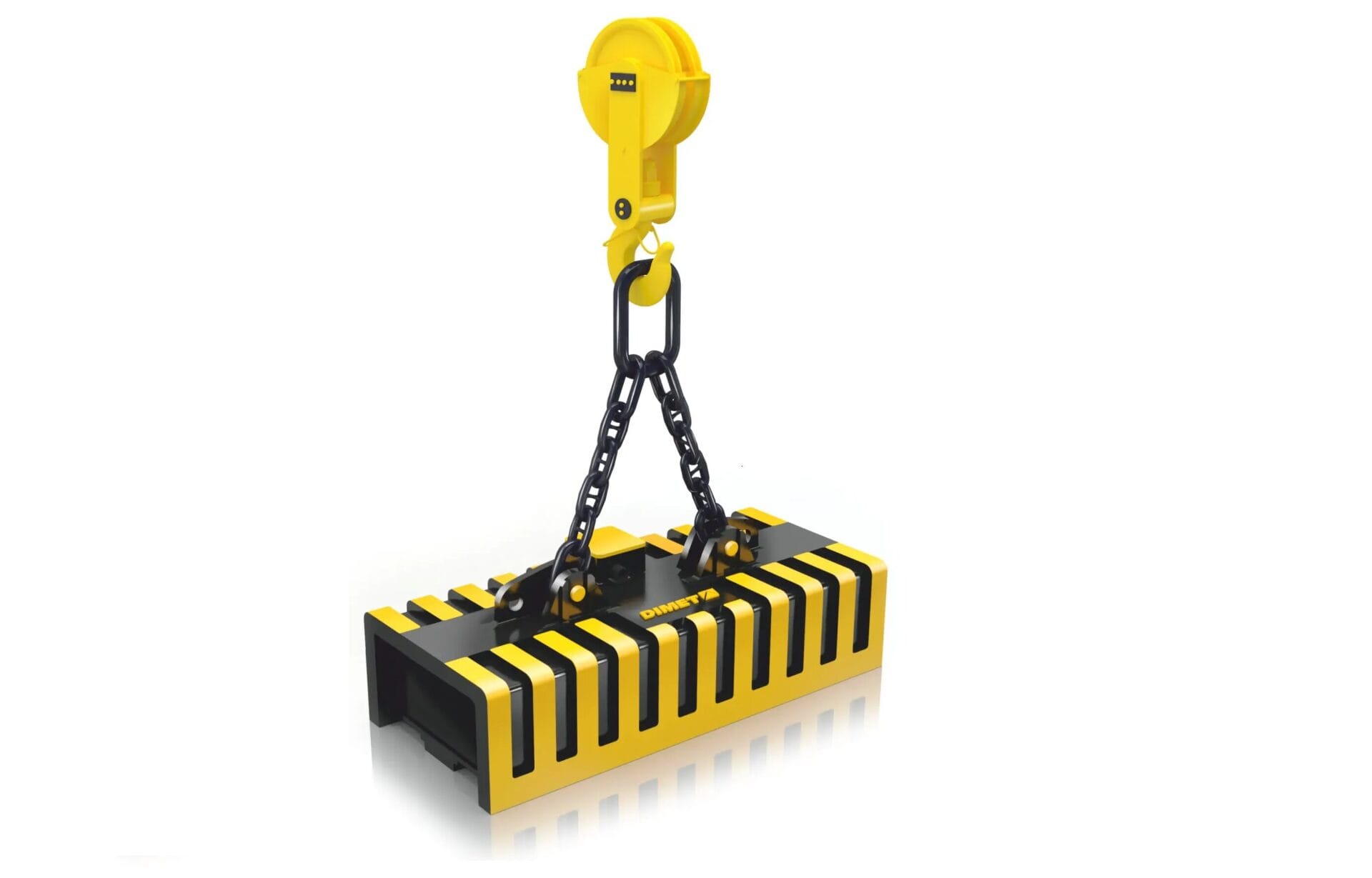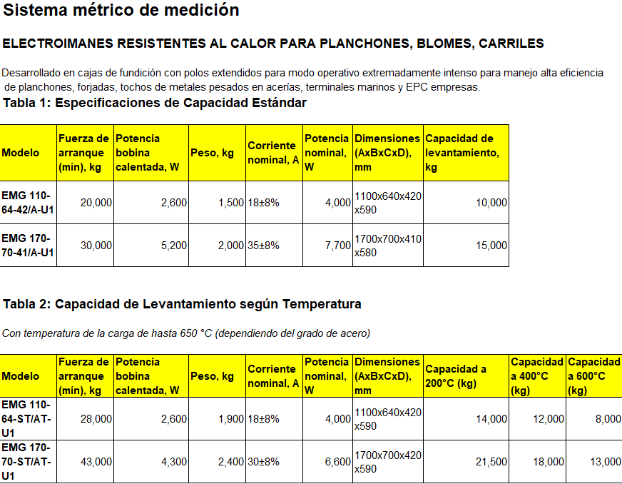 Los electroimanes rectangulares de la serie DIMET EMG con un núcleo magnético fundido se destina a la manipulación de piezas metálicas semiacabadas, rieles y productos forjados. Son modelos más avanzados de los electroimanes equivalentes PM15, PM25, PM26 construidos en la URSS. Disponible en versión resistente al calor para cargas calientes (de hasta 650 ˚С).