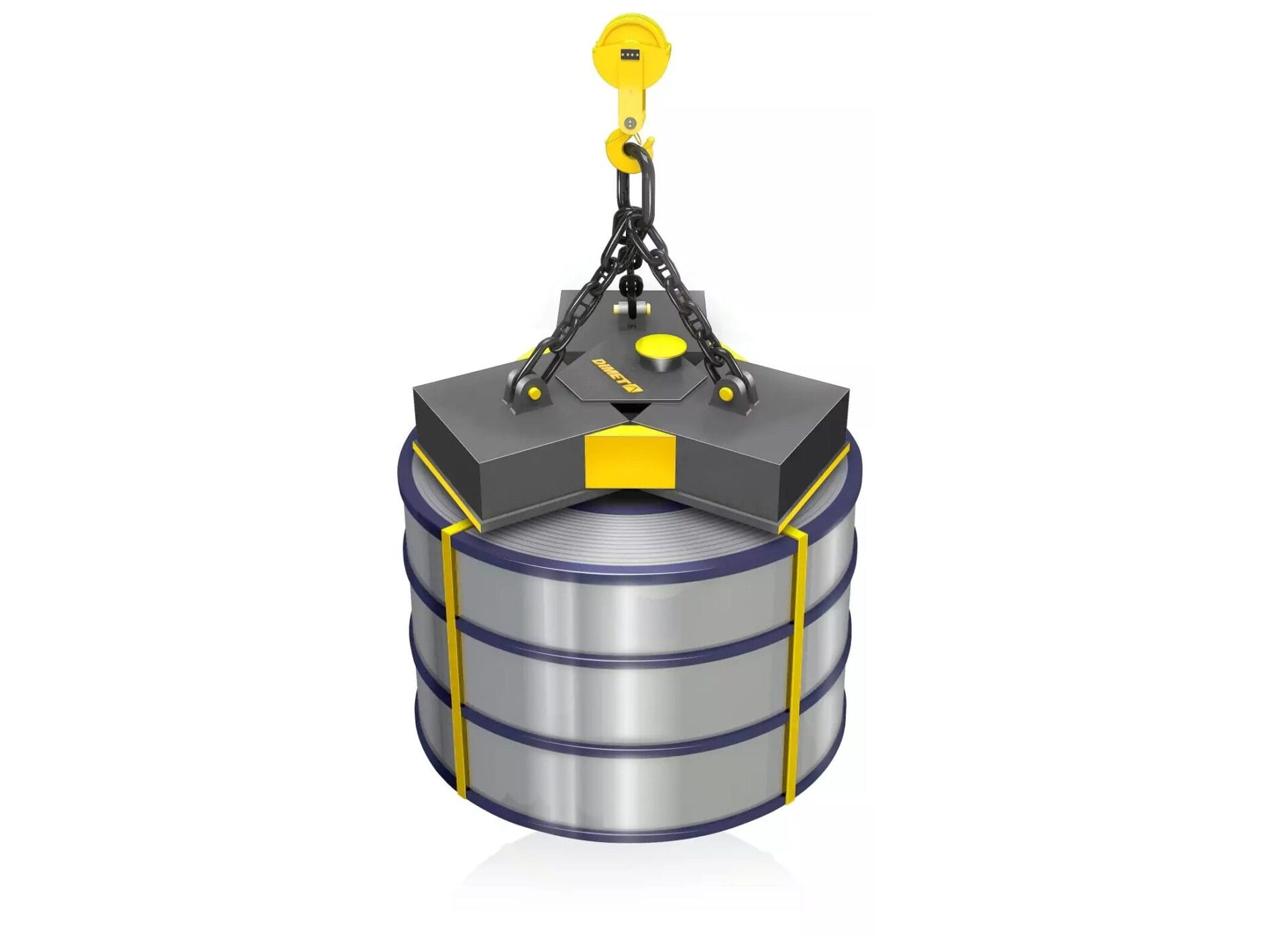 La serie especial de electroimanes DIMET EMGR se emplea para la manipulación de bobinas de chapas de acero y de alambrón en sentido vertical. Disponible, demás, en versión resistente al calor para cargas calientes (de hasta 650 ˚С).
